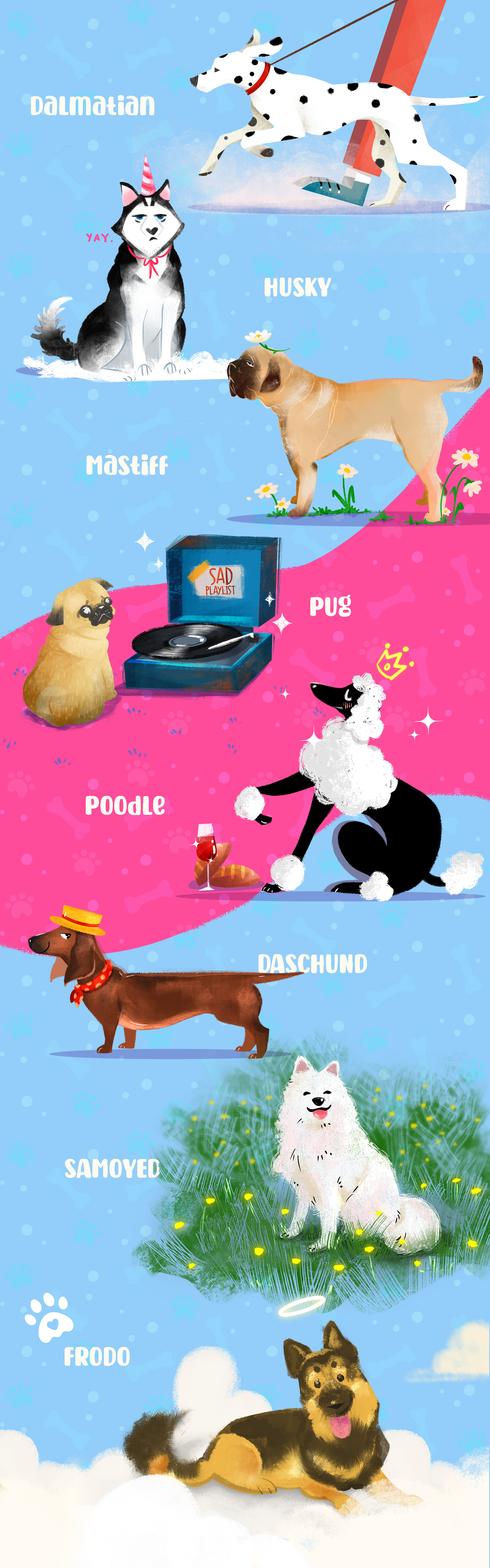 I love dogs albeit never having them as a pet (yet), so I drew a few good bois for DOGGUST! In a stylized illustration.